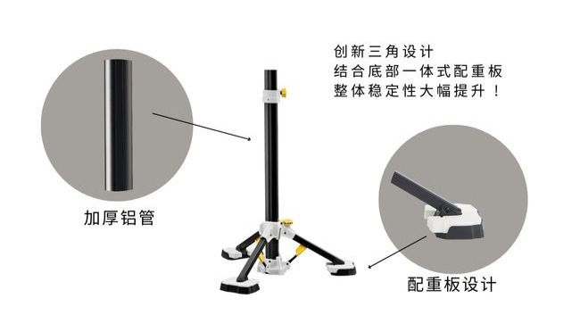 创新三角加粗铝管设计,结合底部一体式配重板,整体稳定性大幅提升,无需额外注水或加沙,减少操作步骤,使用更便捷,体验更安心。